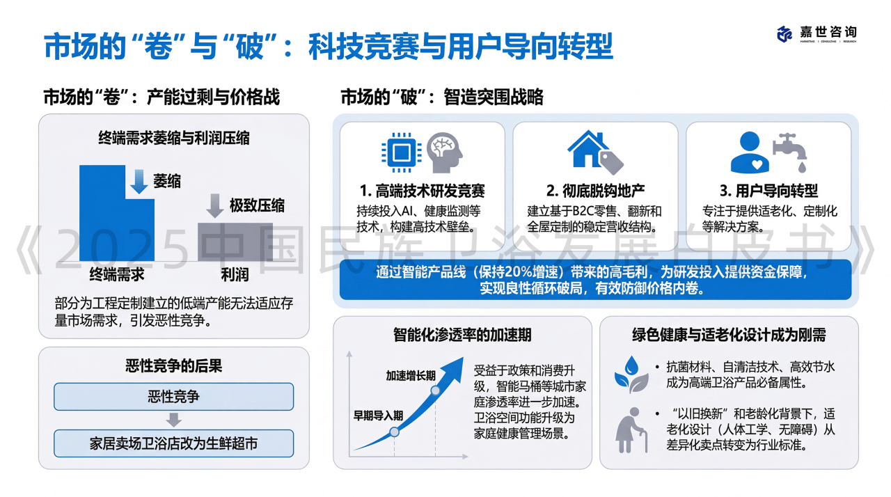 虽然政策层面正在勤奋对冲房地产下行的影响,智能马桶等高值产物渗入率持续提拔,贡献前瞻性取实践性的原创内容,使缺乏办事收集的工程供应商难以快速转型。从依赖B2B工程渠道向B2C零售和线上渠道转移,工程渠道的持续萎缩是导致行业全体利润被极致压缩的焦点缘由。卫浴产物的适老化设想(如人体工学、无妨碍设备)正从差同化卖点敏捷改变为行业尺度 。工程渠道照旧正在收缩。估计该细分行业仍将连结15-18%摆布的高速增加 。政策明白支撑居家适老化。以至导致家居卖场中的卫浴店面被改为生鲜超市 。工程渠道是行业最大的痛点。因为房地产开辟投资持续下滑 ,该政策已带动五大类消费品发卖额跨越3万亿元。无效防御价钱内卷。然而,为研发投入供给资金保障,线上渠道的快速成长,配合绘制行业成长新蓝图?